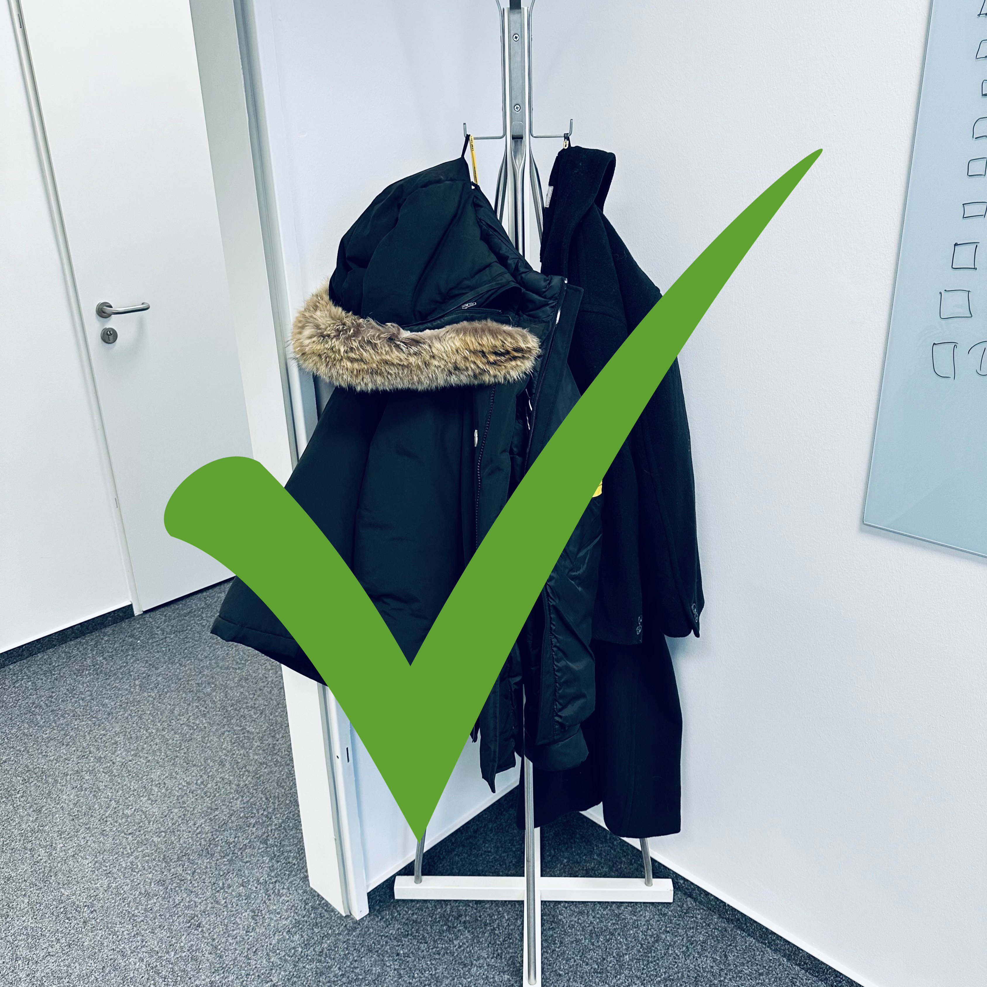Im ersten Raum auf der linken Seite vom Eingang findest du einen Garderobenständer. Dort kannst du während deiner Arbeitszeit deine Jacke, deinen Regenschirm oder andere persönliche Gegenstände verstauen.