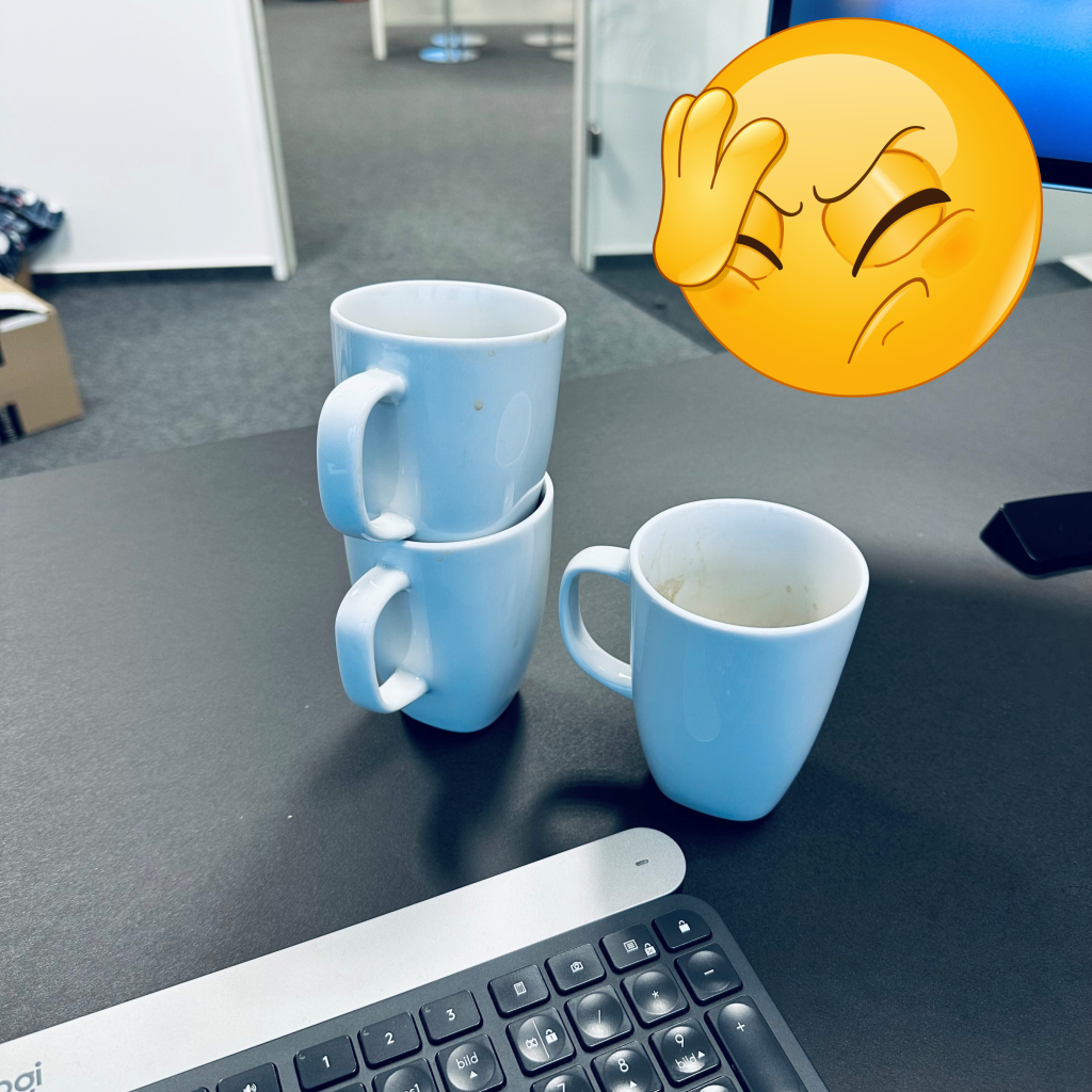 Zudem gehört ein ordentlicher Umgang mit der Kaffeemaschine dazu. Bitte achtet darauf, dass vorne keine herrenlosen Tassen stehen, und falls du auf dem Weg zur Küche bist – auch wenn es nicht deine Tasse ist – nimm sie mit.