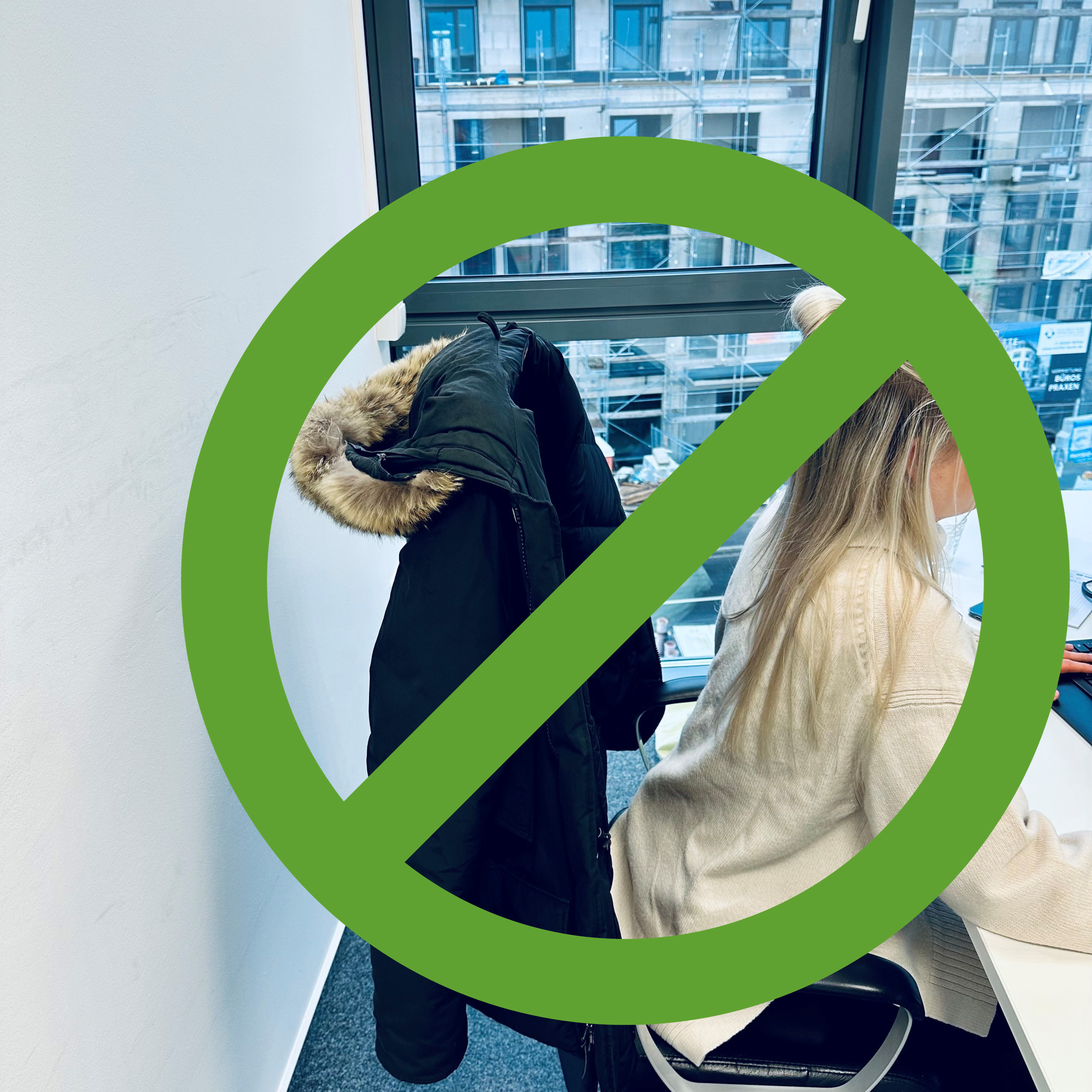 Wir bitten dich darum, dies zu berücksichtigen, da es in Teams-Meetings mit unseren Kunden nicht besonders ansprechend wirkt, wenn der Kragen deiner Jacke ins Bild ragt. Außerdem bleiben der Geruch von Regen oder Zigarettenrauch draußen.